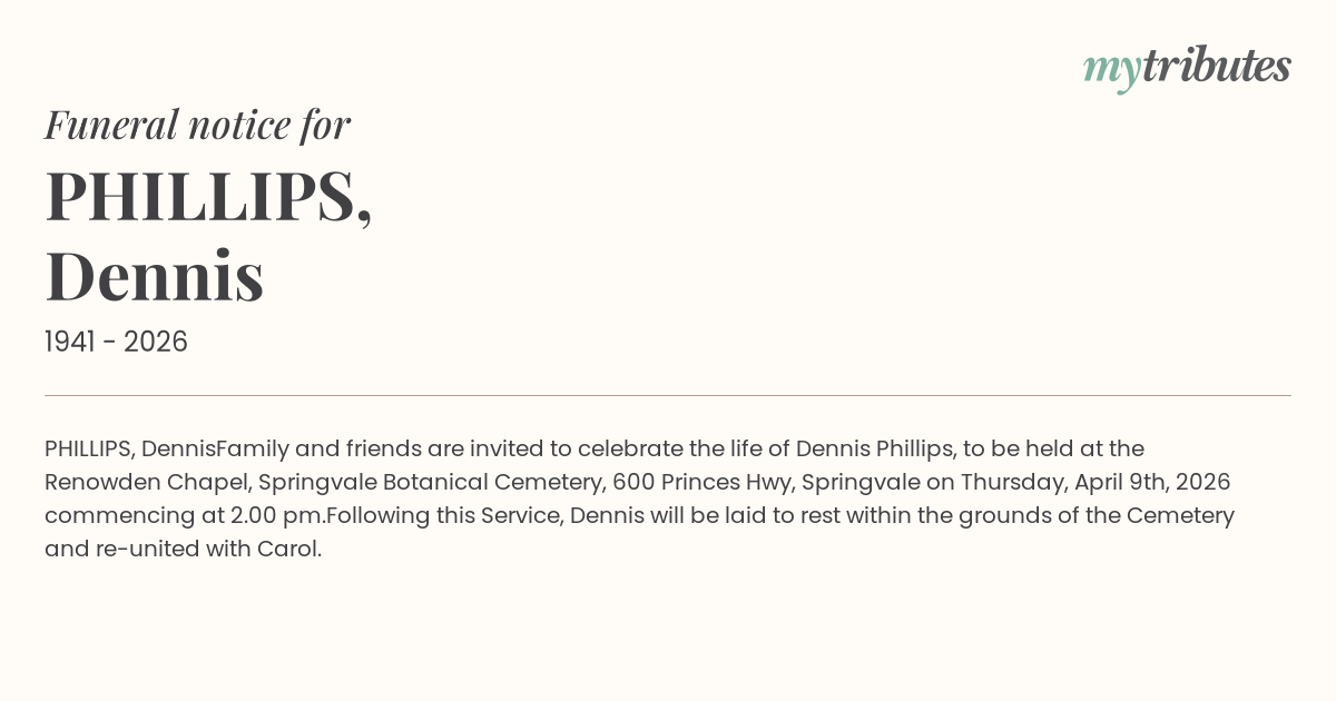 Family and friends are invited to celebrate the life of Dennis Phillips, to be held at the Renowden Chapel, Springvale Botanical Cemetery, 600 Princes Hwy, Springvale on Thursday, April 9th, 2026 commencing at 2.00 pm.