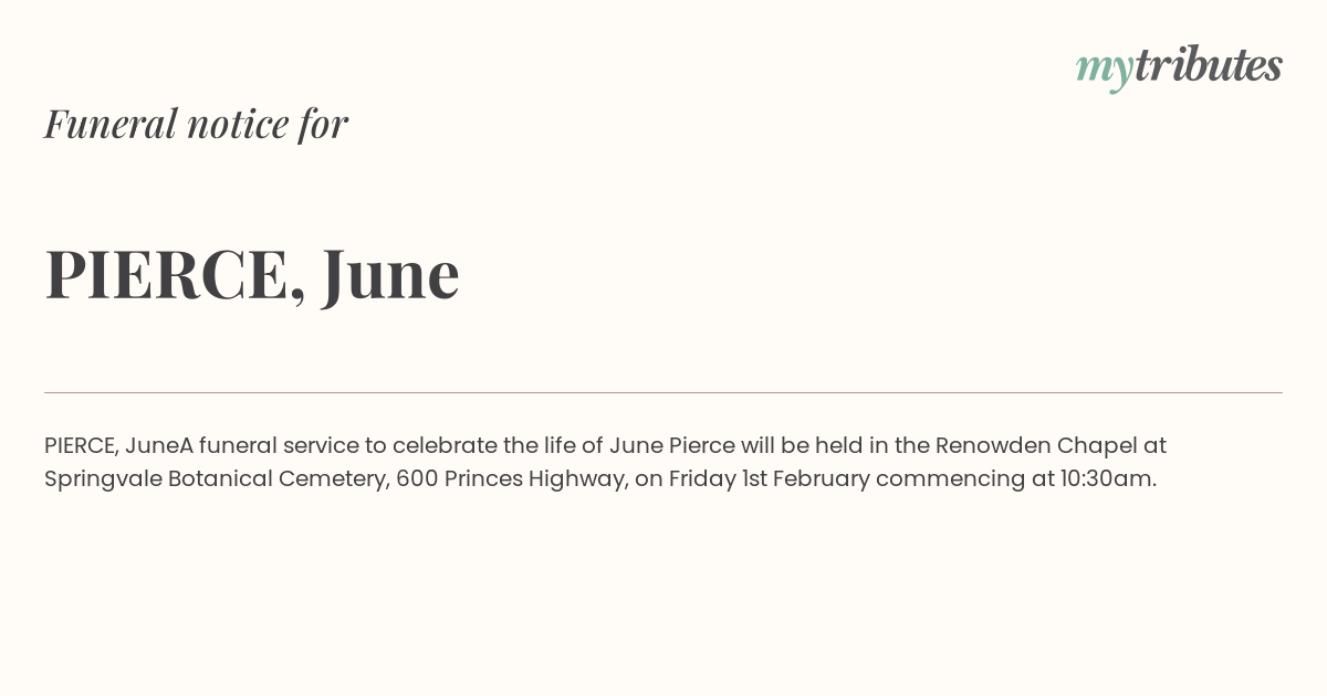 A funeral service to celebrate the life of June Pierce will be held in the Renowden Chapel at Springvale Botanical Cemetery, 600 Princes Highway, on Friday 1st February commencing at 10:30am.
