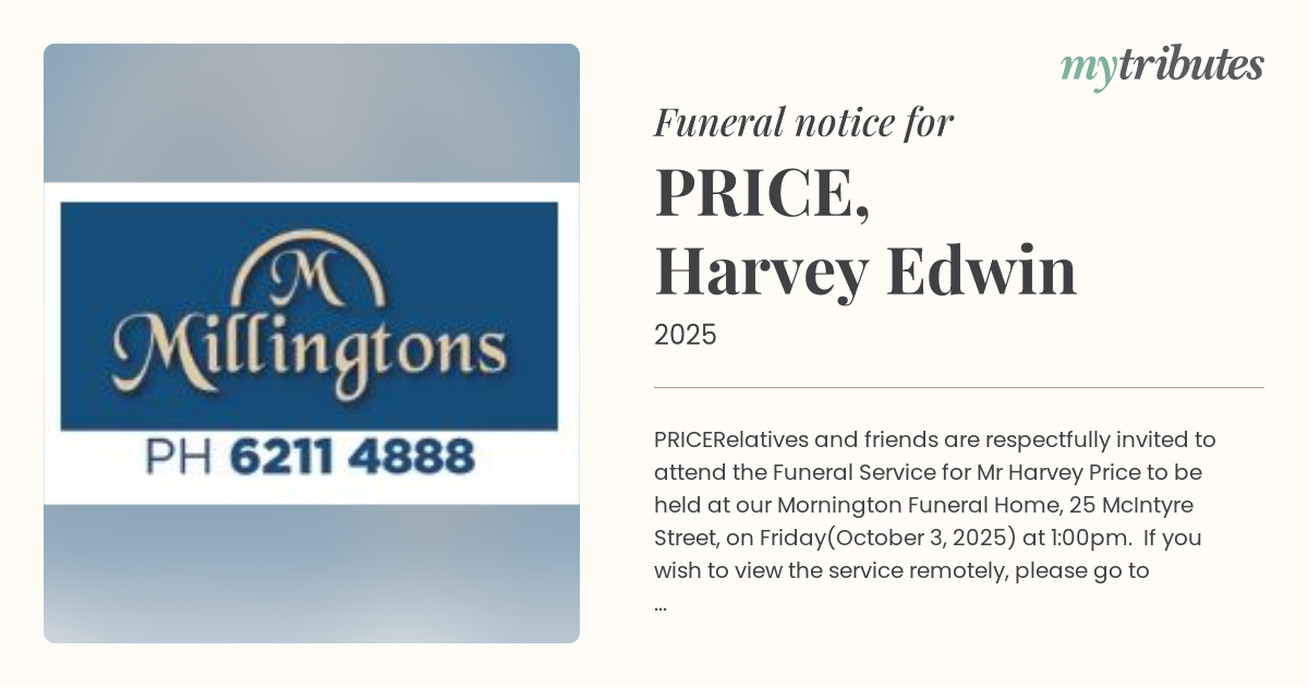 Relatives and friends are respectfully invited to attend the Funeral Service for Mr Harvey Price to be held at our Mornington Funeral Home, 25 McIntyre Street, on Friday(October 3, 2025) at 1:00pm.