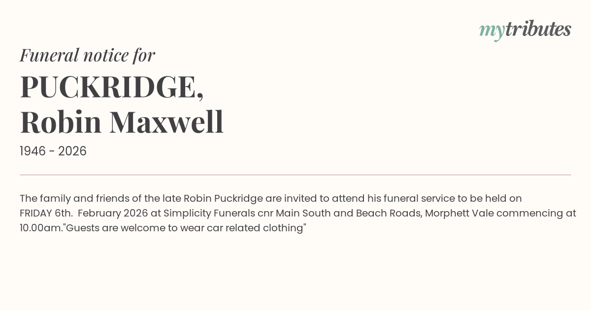 16°CThe family and friends of the late Robin Puckridge are invited to attend his funeral service to be held on FRIDAY 6th. February 2026 at Simplicity Funerals cnr Main South and Beach Roads, Morphett Vale commencing at 10.00am.