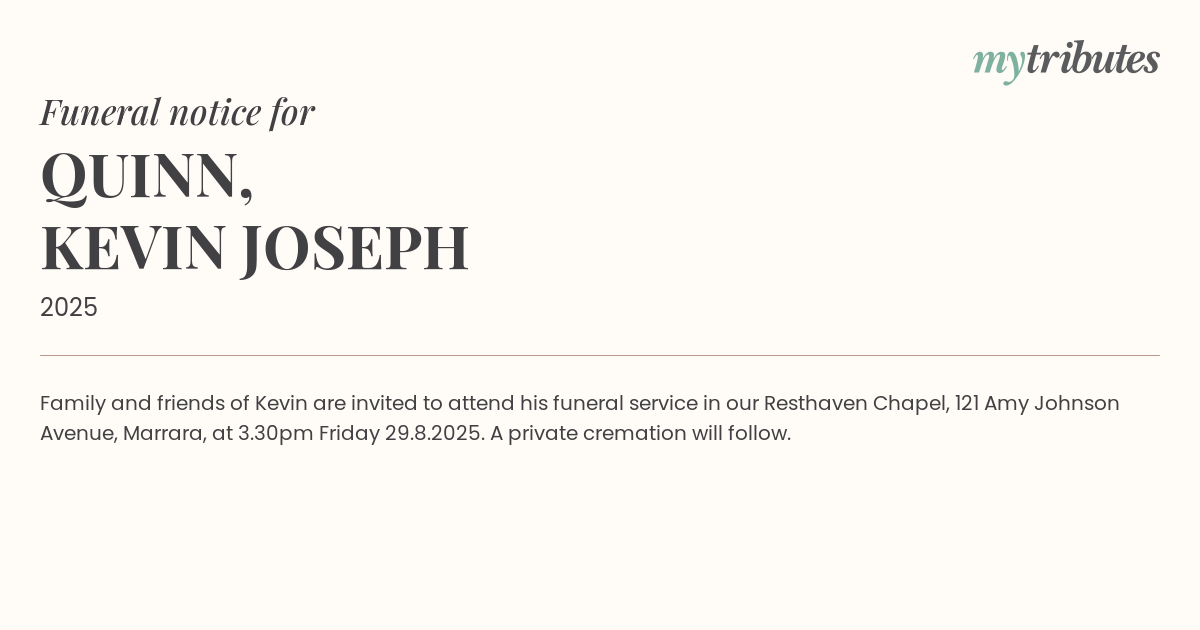 16°CFamily and friends of Kevin are invited to attend his funeral service in our Resthaven Chapel, 121 Amy Johnson Avenue, Marrara, at 3.30pm Friday 29.8.2025. A private cremation will follow.