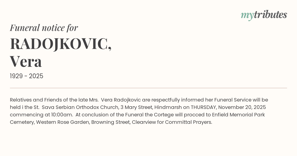 16°CRelatives and Friends of the late Mrs. Vera Radojkovic are respectfully informed her Funeral Service will be held i the St. Sava Serbian Orthodox Church, 3 Mary Street, Hindmarsh on THURSDAY, November 20, 2025 commencing at 10:00am. At conclusion of the Funeral the Cortege will procced to Enfield Memorial Park Cemetery, Western Rose Garden, Browning Street, Clearview for Committal Prayers.