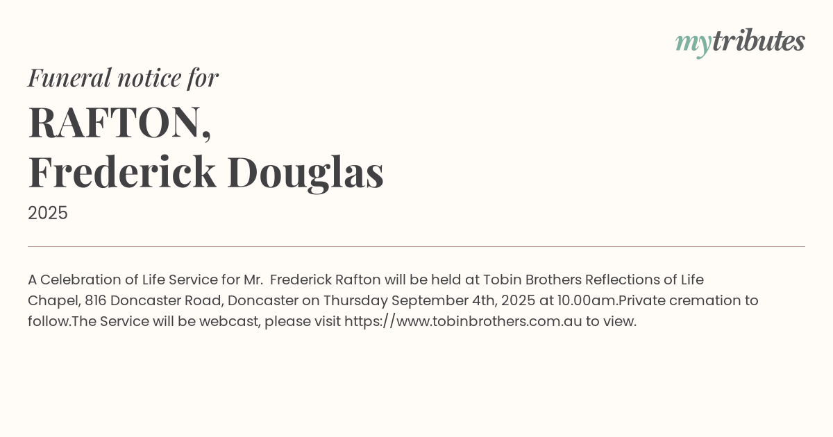 16°CA Celebration of Life Service for Mr. Frederick Rafton will be held at Tobin Brothers Reflections of Life Chapel, 816 Doncaster Road, Doncaster on Thursday September 4th, 2025 at 10.00am.