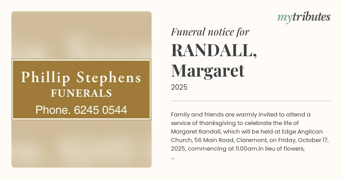 16°CFamily and friends are warmly invited to attend a service of thanksgiving to celebrate the life of Margaret Randall, which will be held at Edge Anglican Church, 56 Main Road, Claremont, on Friday, October 17, 2025, commencing at 11.00am.