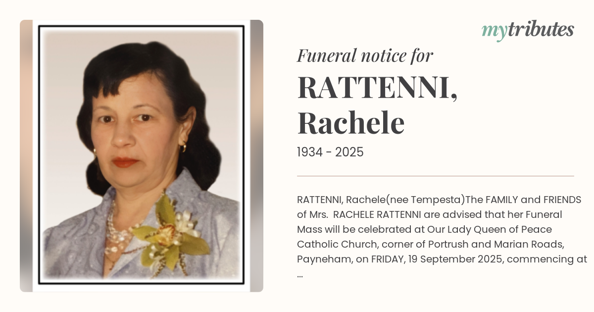 The FAMILY and FRIENDS of Mrs. RACHELE RATTENNI are advised that her Funeral Mass will be celebrated at Our Lady Queen of Peace Catholic Church, corner of Portrush and Marian Roads, Payneham, on FRIDAY, 19 September 2025, commencing at 11.30am.