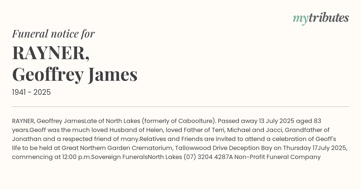 Relatives and Friends are invited to attend a celebration of Geoff's life to be held at Great Northern Garden Crematorium, Tallowwood Drive Deception Bay on Thursday 17July 2025, commencing at 12:00 p.m.