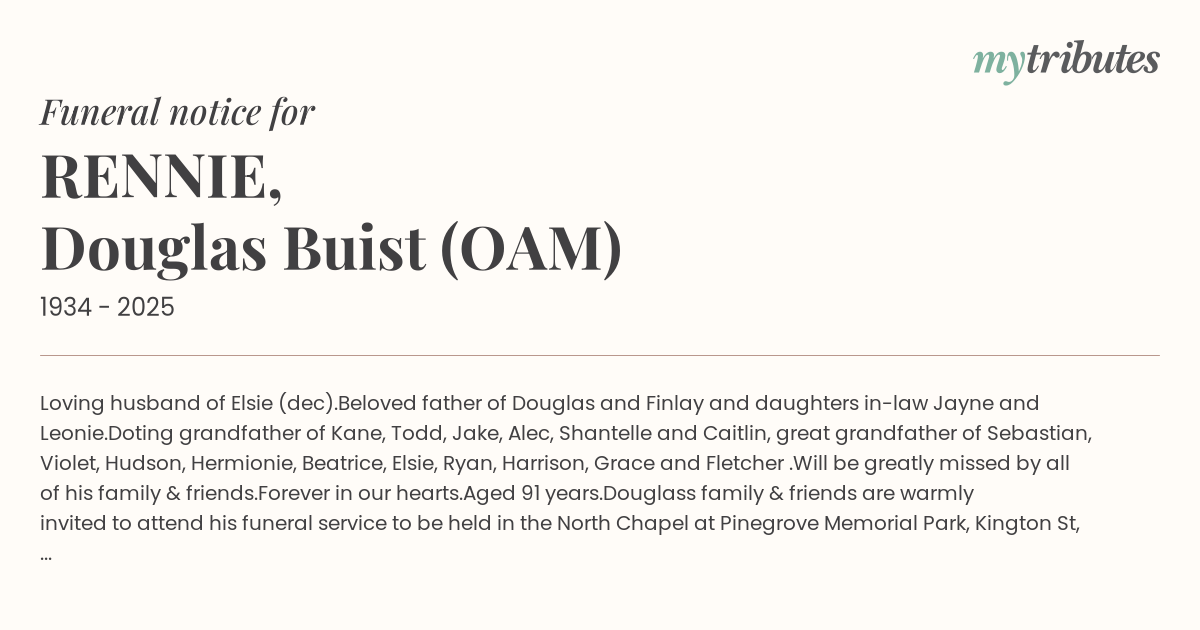 Douglas’s family & friends are warmly invited to attend his funeral service to be held in the North Chapel at Pinegrove Memorial Park, Kington St, Minchinbury on Friday 12th September 2025, to commence at 11:00am.