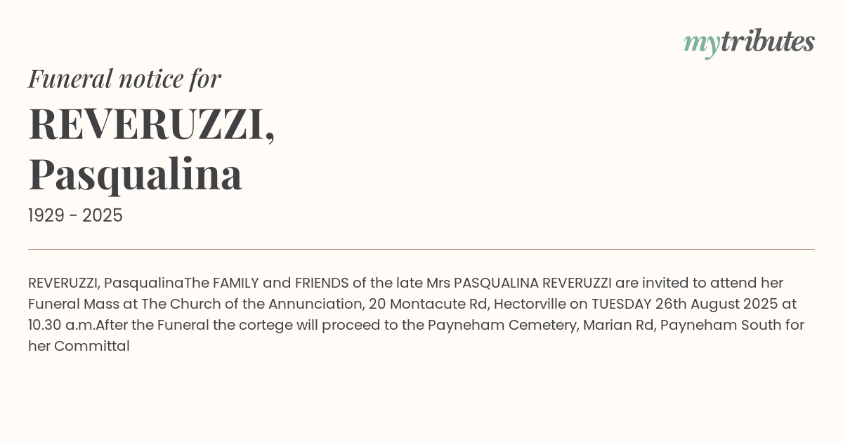 The FAMILY and FRIENDS of the late Mrs PASQUALINA REVERUZZI are invited to attend her Funeral Mass at The Church of the Annunciation, 20 Montacute Rd, Hectorville on TUESDAY 26th August 2025 at 10.30 a.m.