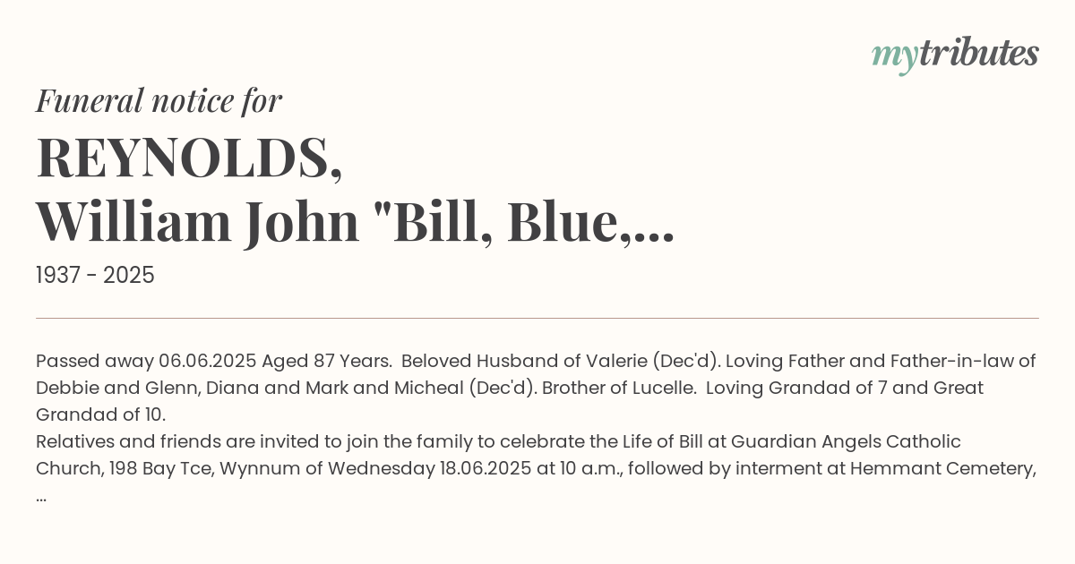 Relatives and friends are invited to join the family to celebrate the Life of Bill at Guardian Angels Catholic Church, 198 Bay Tce, Wynnum of Wednesday 18.06.2025 at 10 a.m., followed by interment at Hemmant Cemetery, Hemmant and Tingalpa Rd, Hemmant.