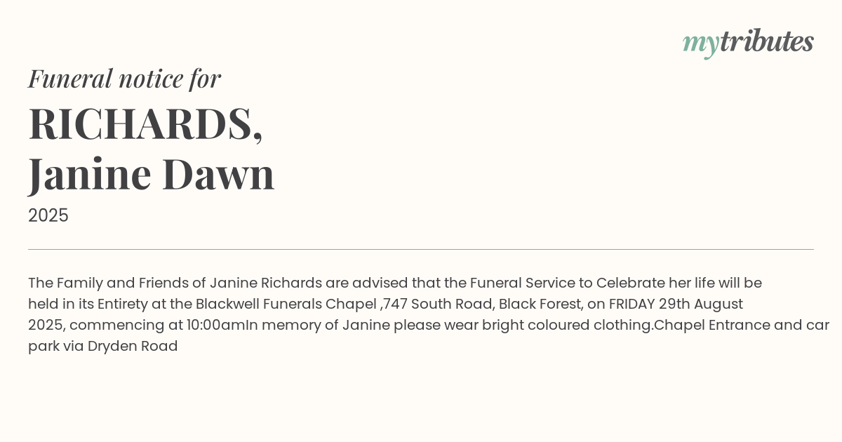16°CThe Family and Friends of Janine Richards are advised that the Funeral Service to Celebrate her life will be held in its Entirety at the Blackwell Funerals Chapel ,747 South Road, Black Forest, on FRIDAY 29th August 2025, commencing at 10:00am