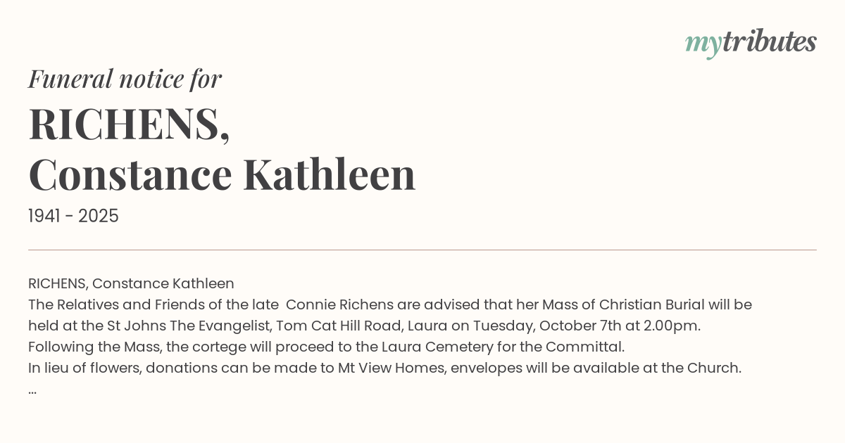 The Relatives and Friends of the late Connie Richens are advised that her Mass of Christian Burial will be held at the St John’s The Evangelist, Tom Cat Hill Road, Laura on Tuesday, October 7th at 2.00pm.