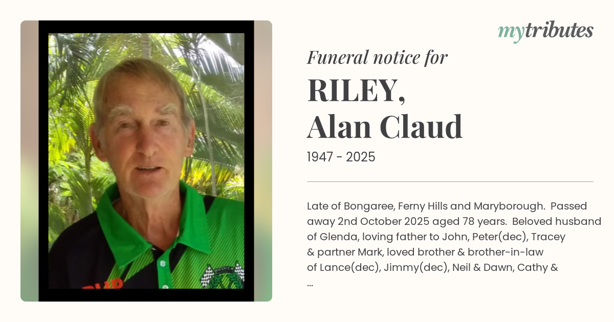 16°CLate of Bongaree, Ferny Hills and Maryborough. Passed away 2nd October 2025 aged 78 years. Beloved husband of Glenda, loving father to John, Peter(dec), Tracey & partner Mark, loved brother & brother-in-law of Lance(dec), Jimmy(dec), Neil & Dawn, Cathy & Charlie & Kevin(dec). Loved Uncle of their families. Adored Pa to all his grandchildren and great-grandchildren. Family and friends are invited to attend a graveside service at Albany Creek Cemetery 24 Faheys Rd East, Albany Creek on Monday 20th October 2025 at 10am.