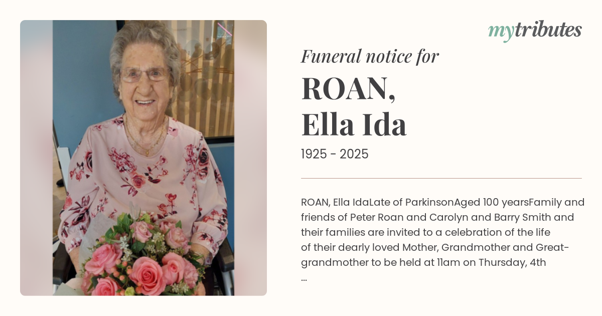 Family and friends of Peter Roan and Carolyn and Barry Smith and their families are invited to a celebration of the life of their dearly loved Mother, Grandmother and Great-grandmother to be held at 11am on Thursday,