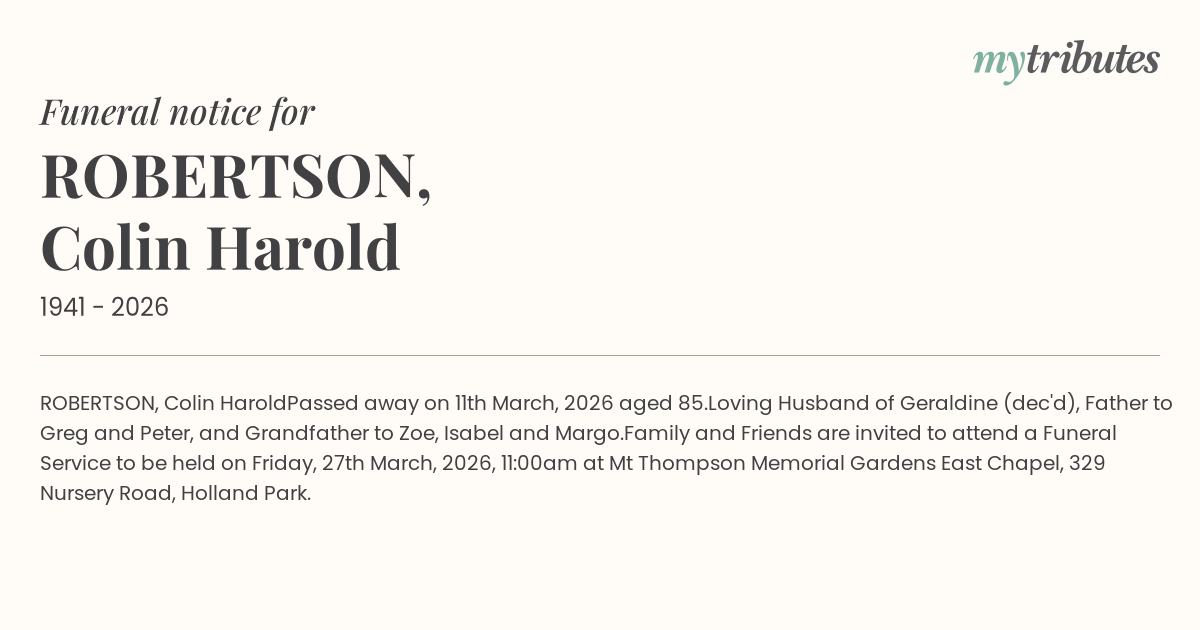 Family and Friends are invited to attend a Funeral Service to be held on Friday, 27th March, 2026, 11:00am at Mt Thompson Memorial Gardens East Chapel, 329 Nursery Road, Holland Park.