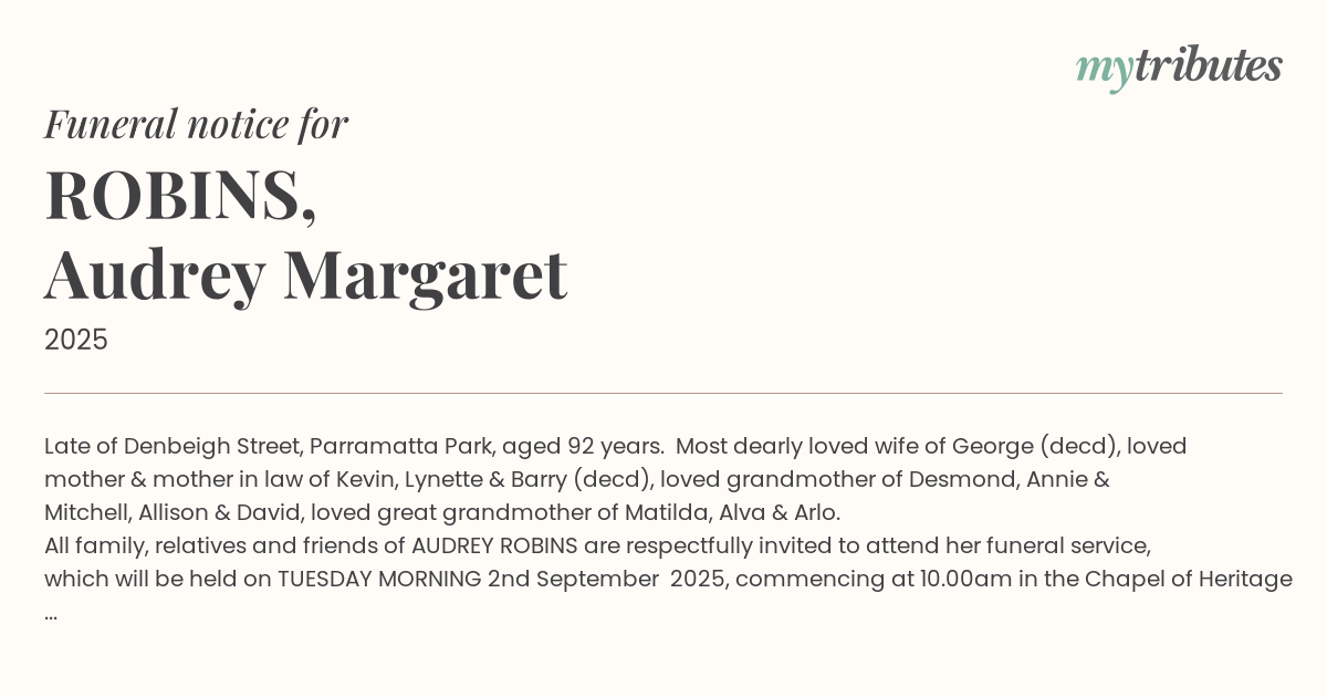 All family, relatives and friends of AUDREY ROBINS are respectfully invited to attend her funeral service, which will be held on TUESDAY MORNING 2nd September 2025, commencing at 10.00am in the Chapel of Heritage Brady Funeral Directors 76 Maher Road, Gordonvale, followed by interment