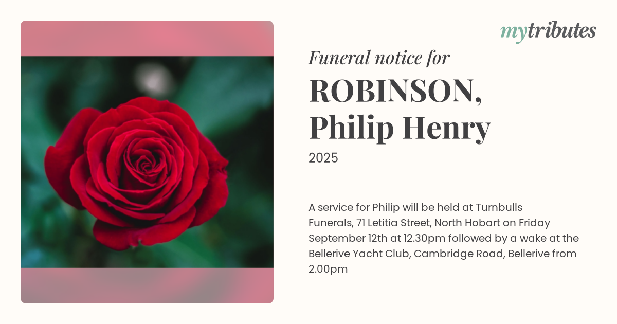 16°CA service for Philip will be held at Turnbulls Funerals, 71 Letitia Street, North Hobart on Friday September 12th at 12.30pm followed by a wake at the Bellerive Yacht Club, Cambridge Road, Bellerive from 2.00pm