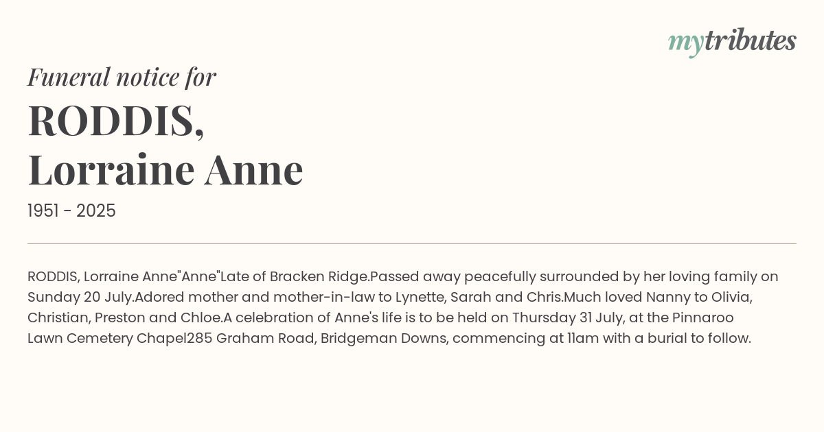 A celebration of Anne's life is to be held on Thursday 31 July, at the Pinnaroo Lawn Cemetery Chapel