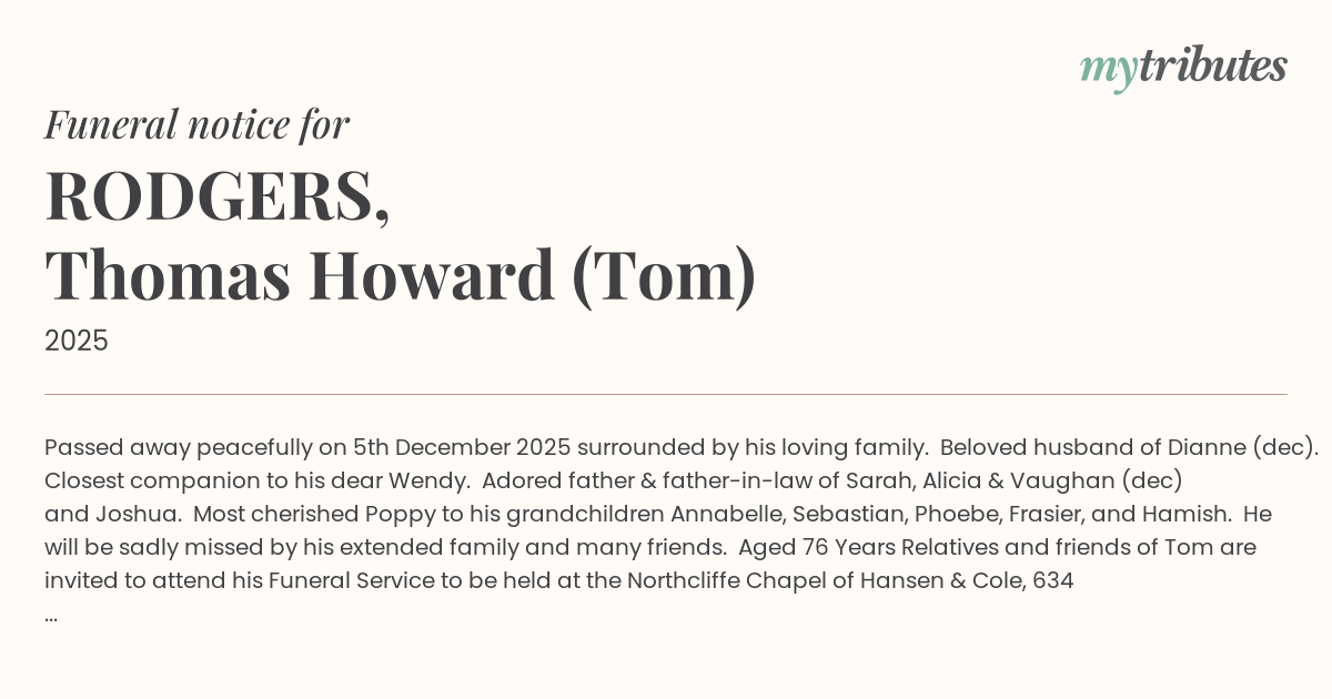 16°CPassed away peacefully on 5th December 2025 surrounded by his loving family. Beloved husband of Dianne (dec). Closest companion to his dear Wendy. Adored father & father-in-law of Sarah, Alicia & Vaughan (dec) and Joshua. Most cherished Poppy to his grandchildren Annabelle, Sebastian, Phoebe, Frasier, and Hamish. He will be sadly missed by his extended family and many friends.