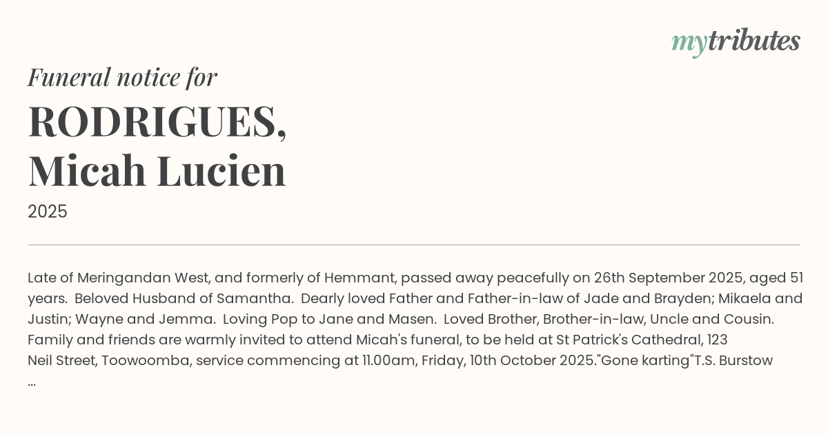 Family and friends are warmly invited to attend Micah's funeral, to be held at St Patrick's Cathedral, 123 Neil Street, Toowoomba, service commencing at 11.00am, Friday, 10th October 2025.