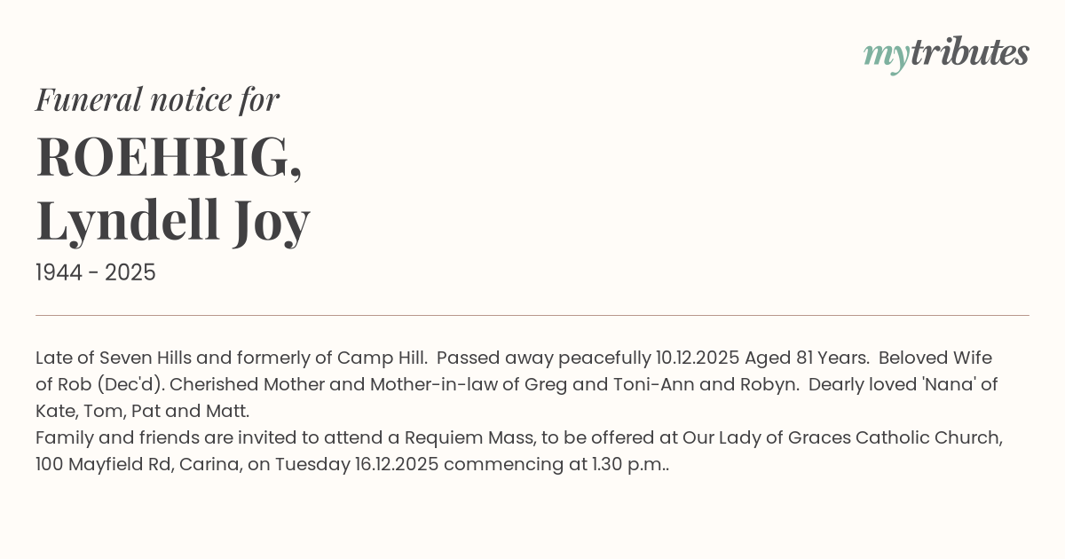 16°CLate of Seven Hills and formerly of Camp Hill. Passed away peacefully 10.12.2025 Aged 81 Years. Beloved Wife of Rob (Dec'd). Cherished Mother and Mother-in-law of Greg and Toni-Ann and Robyn. Dearly loved 'Nana' of Kate, Tom, Pat and Matt.