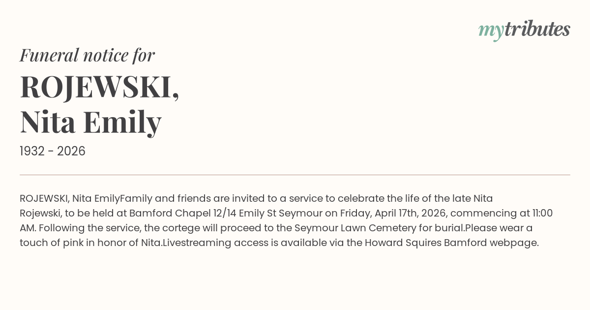 Family and friends are invited to a service to celebrate the life of the late Nita Rojewski, to be held at Bamford Chapel 12/14 Emily St Seymour on Friday, April 17th, 2026, commencing at 11:00 AM. Following the service, the cortege will proceed to the Seymour Lawn Cemetery for burial.
