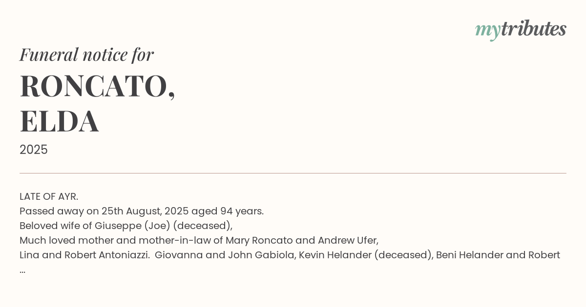 A service to celebrate the life of ELDA will commence with Requiem Mass at 11am. THURSDAY, 4TH SEPTEMBER at the Sacred Heart Catholic Church, Ayr followed by interment in the Ayr Cemetery.
