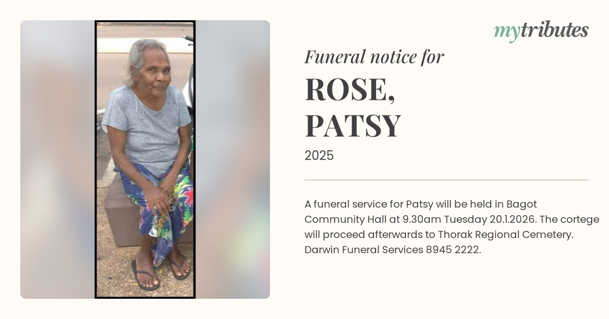 16°CA funeral service for Patsy will be held in Bagot Community Hall at 9.30am Tuesday 20.1.2026. The cortege will proceed afterwards to Thorak Regional Cemetery. Darwin Funeral Services 8945... .