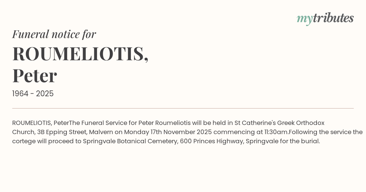The Funeral Service for Peter Roumeliotis will be held in St Catherine's Greek Orthodox Church, 3B Epping Street, Malvern on Monday 17th November 2025 commencing at 11:30am.