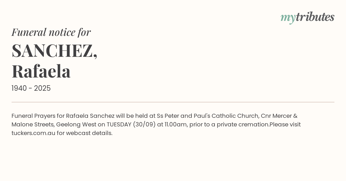 16°CFuneral Prayers for Rafaela Sanchez will be held at Ss Peter and Paul's Catholic Church, Cnr Mercer & Malone Streets, Geelong West on TUESDAY (30/09) at 11.00am, prior to a private cremation.