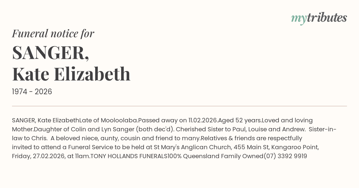 attend a Funeral Service to be held at St Mary's Anglican Church, 455 Main St, Kangaroo Point, Friday, 27.02.2026, at 11am.