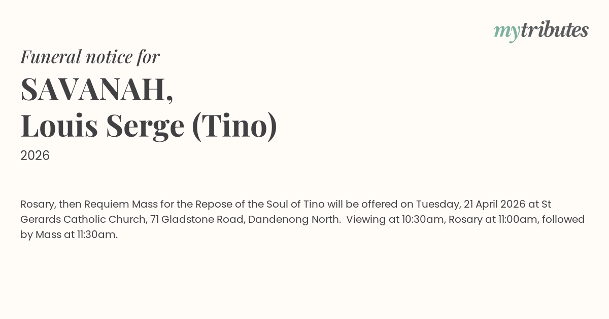 16°CRosary, then Requiem Mass for the Repose of the Soul of Tino will be offered on Tuesday, 21 April 2026 at St Gerard’s Catholic Church, 71 Gladstone Road, Dandenong North. Viewing at 10:30am, Rosary at 11:00am, followed by Mass at 11:30am.