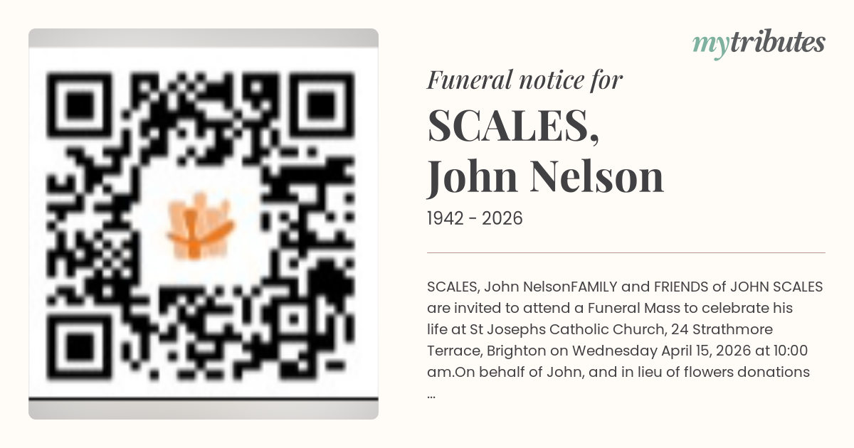 FAMILY and FRIENDS of JOHN SCALES are invited to attend a Funeral Mass to celebrate his life at St Joseph’s Catholic Church, 24 Strathmore Terrace, Brighton on Wednesday April 15, 2026 at 10:00 am.