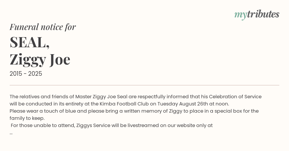 16°CThe relatives and friends of Master Ziggy Joe Seal are respectfully informed that his Celebration of Service will be conducted in its entirety at the Kimba Football Club on Tuesday August 26th at noon.