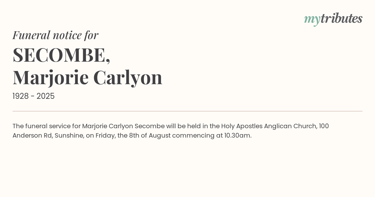 16°CThe funeral service for Marjorie Carlyon Secombe will be held in the Holy Apostles Anglican Church, 100 Anderson Rd, Sunshine, on Friday, the 8th of August commencing at 10.30am.