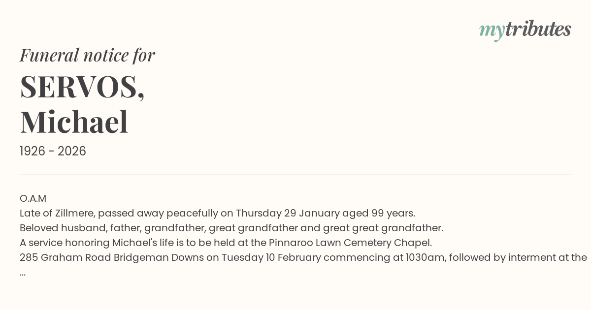 16°CO.A.M Late of Zillmere, passed away peacefully on Thursday 29 January aged 99 years. Beloved husband, father, grandfather, great grandfather and great great grandfather. A service honoring Michael's life is to be held at the Pinnaroo Lawn Cemetery Chapel. 285 Graham Road Bridgeman Downs on Tuesday 10 February commencing at 1030am, followed by interment at the Pinnaroo Lawn Cemetery.