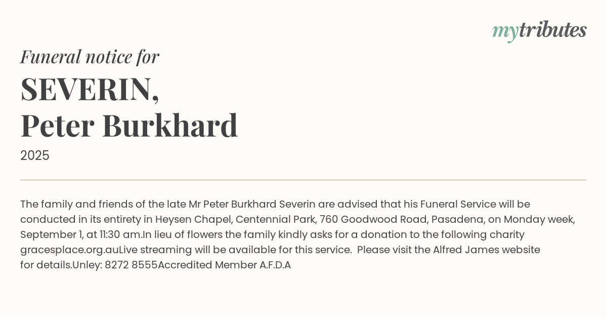 16°CThe family and friends of the late Mr Peter Burkhard Severin are advised that his Funeral Service will be conducted in its entirety in Heysen Chapel, Centennial Park, 760 Goodwood Road, Pasadena, on Monday week, September 1, at 11:30 am.