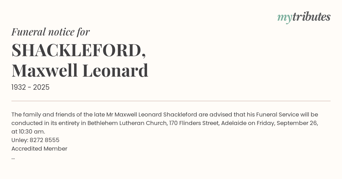 16°CThe family and friends of the late Mr Maxwell Leonard Shackleford are advised that his Funeral Service will be conducted in its entirety in Bethlehem Lutheran Church, 170 Flinders Street, Adelaide on Friday, September 26, at 10:30 am.