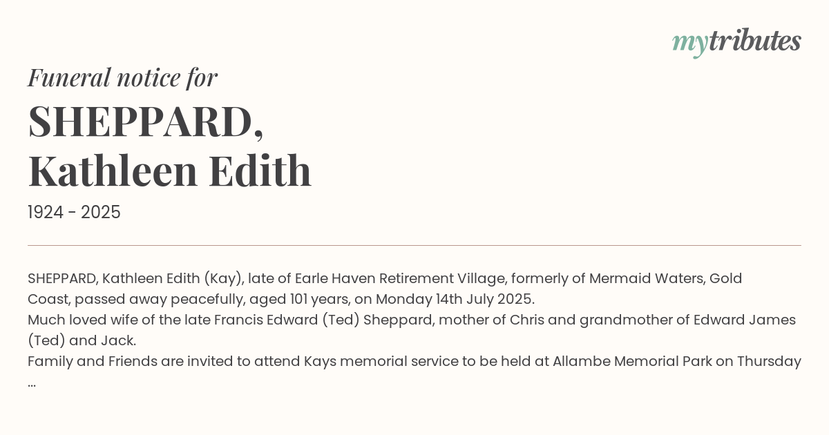 16°CSHEPPARD, Kathleen Edith (Kay), late of Earle Haven Retirement Village, formerly of Mermaid Waters, Gold Coast, passed away peacefully, aged 101 years, on Monday 14th July 2025.