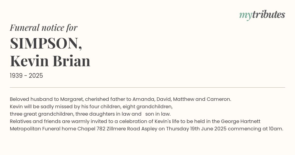 Relatives and friends are warmly invited to a celebration of Kevin's life to be held in the George Hartnett Metropolitan Funeral home Chapel 782 Zillmere Road Aspley on Thursday 19th June 2025 commencing at 10am.