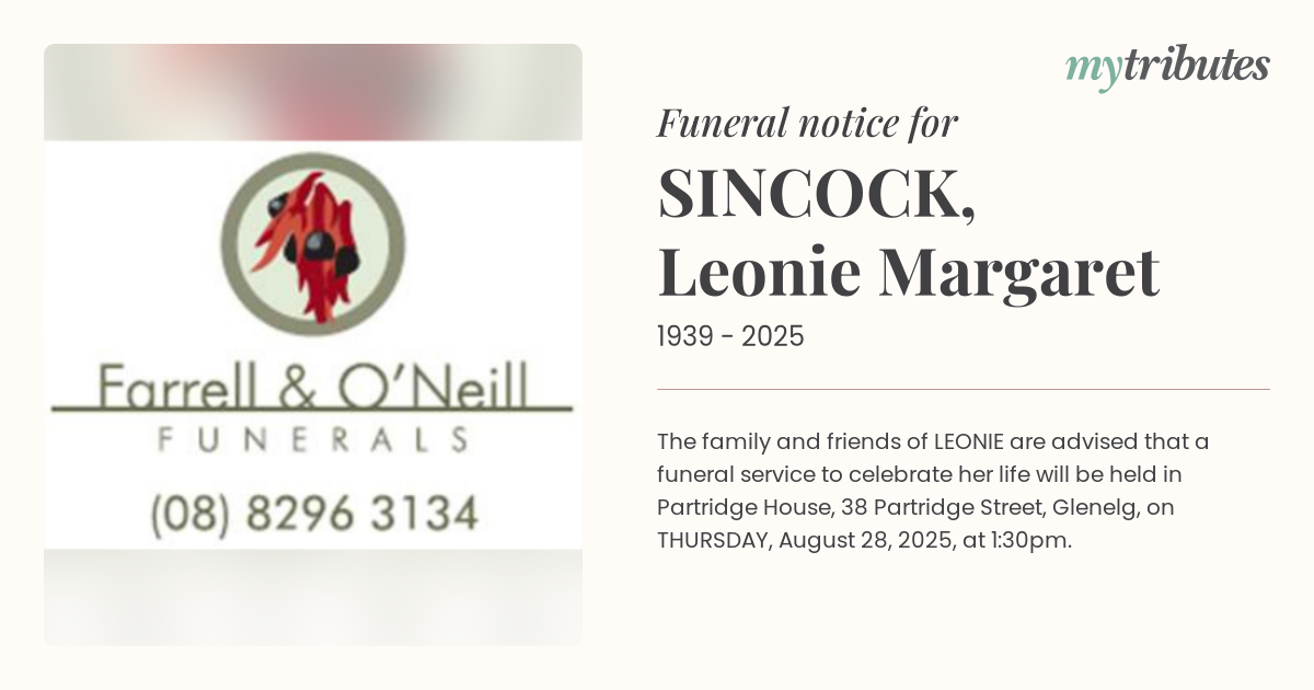 16°CThe family and friends of LEONIE are advised that a funeral service to celebrate her life will be held in Partridge House, 38 Partridge Street, Glenelg, on THURSDAY, August 28, 2025, at 1:30pm.