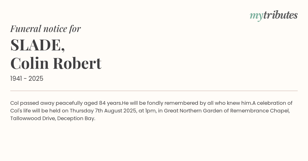 A celebration of Col's life will be held on Thursday 7th August 2025, at 1pm, in Great Northern Garden of Remembrance Chapel, Tallowwood Drive, Deception Bay.