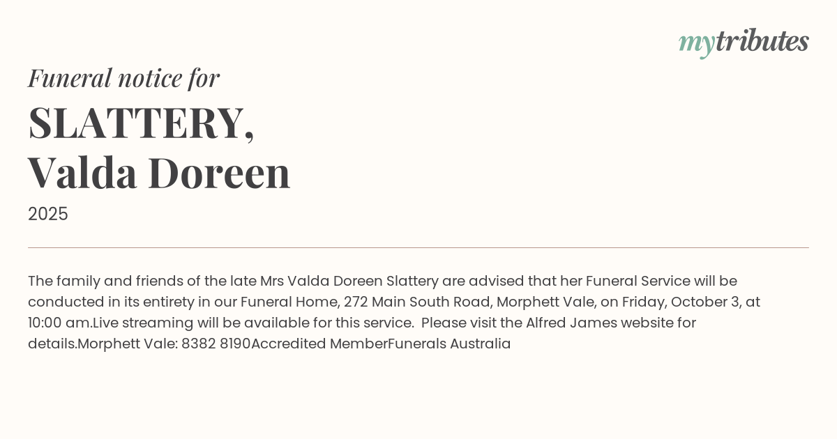 16°CThe family and friends of the late Mrs Valda Doreen Slattery are advised that her Funeral Service will be conducted in its entirety in our Funeral Home, 272 Main South Road, Morphett Vale, on Friday, October 3, at 10:00 am.