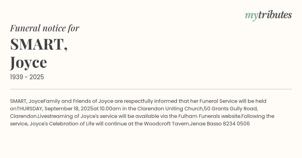 Family and Friends of Joyce are respectfully informed that her Funeral Service will be held on