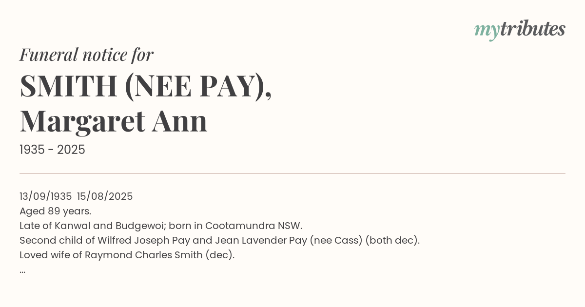 Relatives and friends of Margaret are invited to attend the funeral service to be held in the Rose Chapel, Palmdale Memorial Park, 57 Palmdale Rd, Palmdale on Monday 29 September 2025, commencing at 12 noon.