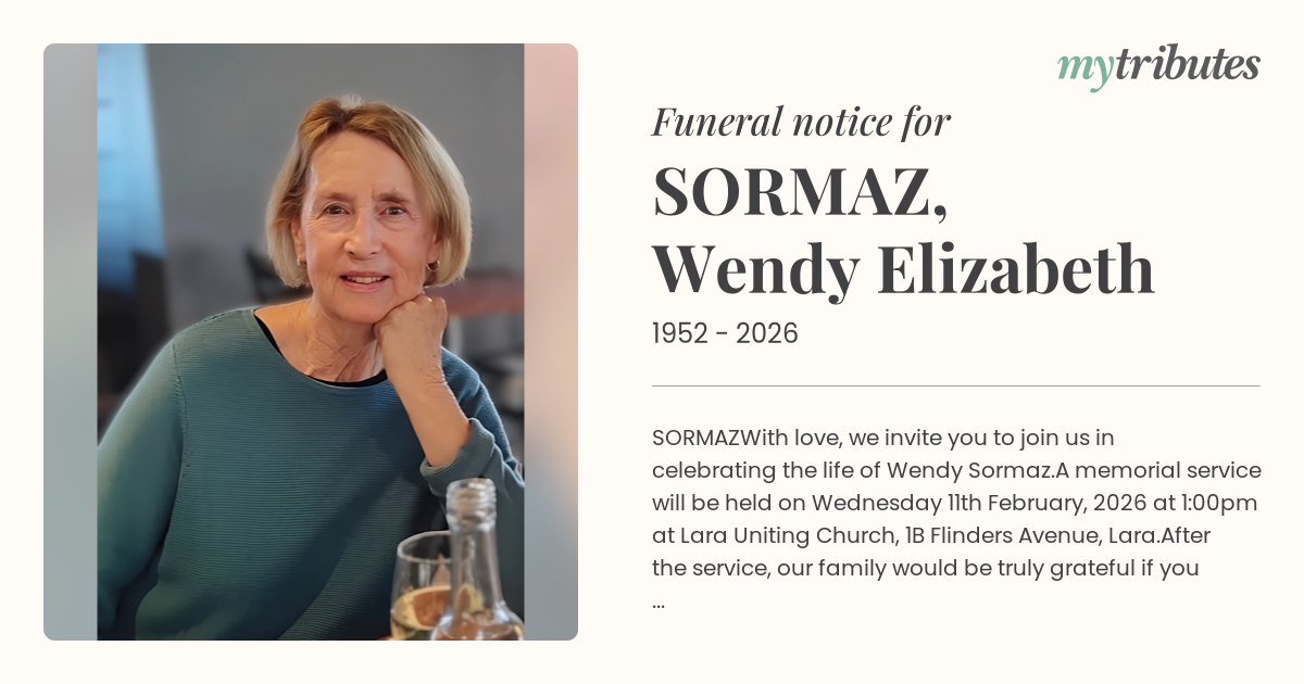 A memorial service will be held on Wednesday 11th February, 2026 at 1:00pm at Lara Uniting Church, 1B Flinders Avenue, Lara.