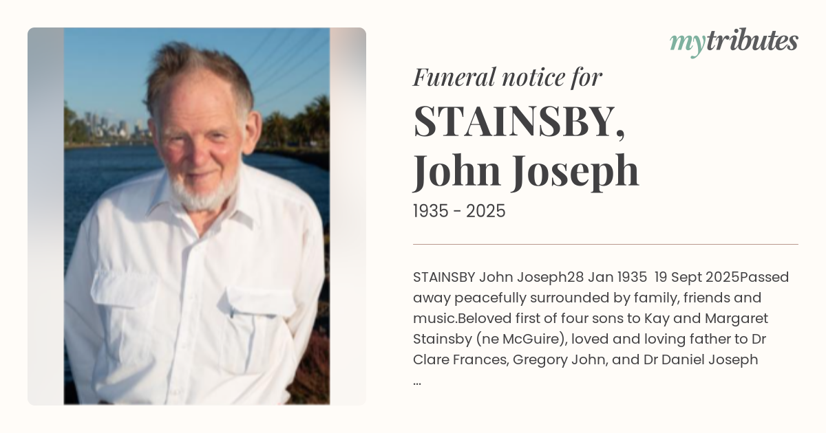 Beloved first of four sons to Kay and Margaret Stainsby (née McGuire), loved and loving father to Dr Clare Frances, Gregory John, and Dr Daniel Joseph Stainsby.