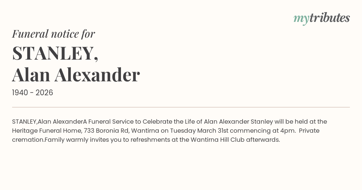 A Funeral Service to Celebrate the Life of Alan Alexander Stanley will be held at the Heritage Funeral Home, 733 Boronia Rd, Wantirna on Tuesday March 31st commencing at 4pm. Private cremation.