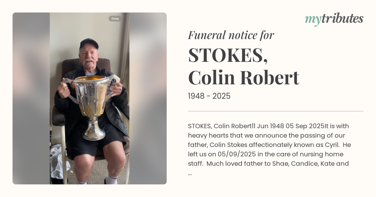 It is with heavy hearts that we announce the passing of our father, Colin Stokes affectionately known as Cyril. He left us on 05/09/2025 in the care of nursing home staff.