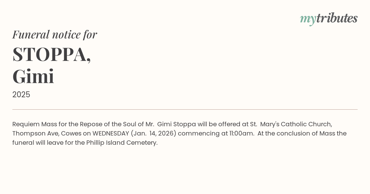16°CRequiem Mass for the Repose of the Soul of Mr. Gimi Stoppa will be offered at St. Mary's Catholic Church, Thompson Ave, Cowes on WEDNESDAY (Jan. 14, 2026) commencing at 11:00am. At the conclusion of Mass the funeral will leave for the Phillip Island Cemetery.