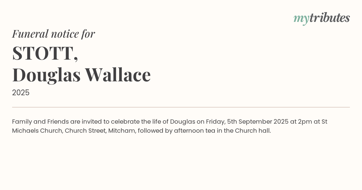 16°CFamily and Friends are invited to celebrate the life of Douglas on Friday, 5th September 2025 at 2pm at St Michael’s Church, Church Street, Mitcham, followed by afternoon tea in the Church hall.